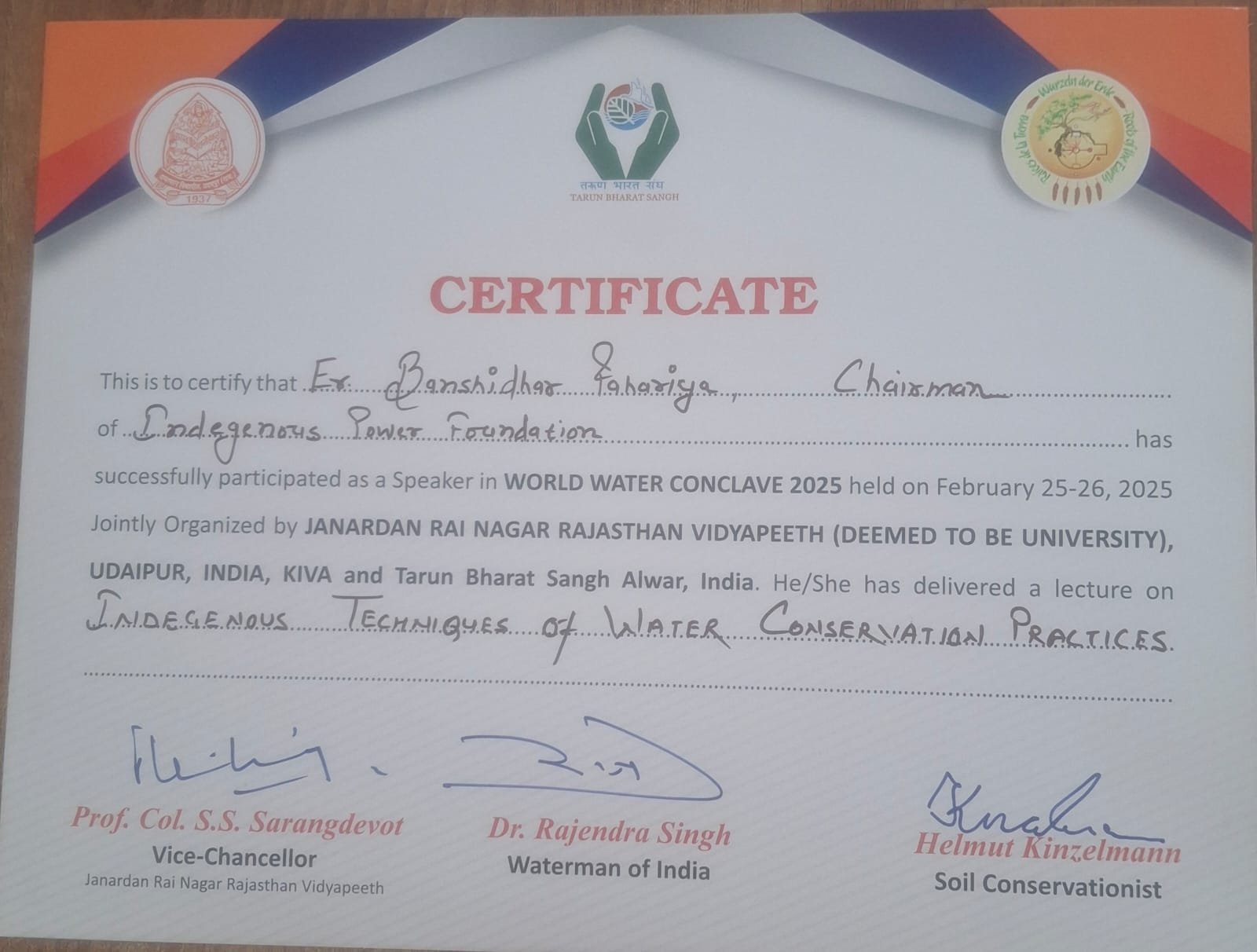 25-26 फरवरी 2025 के वर्ल्ड वाटर कानक्लेव 2025 में ई. बंशीधर पहाड़िया ने देशी तकनीक से जल संरक्षण पर अपना प्रवचन दिया।
